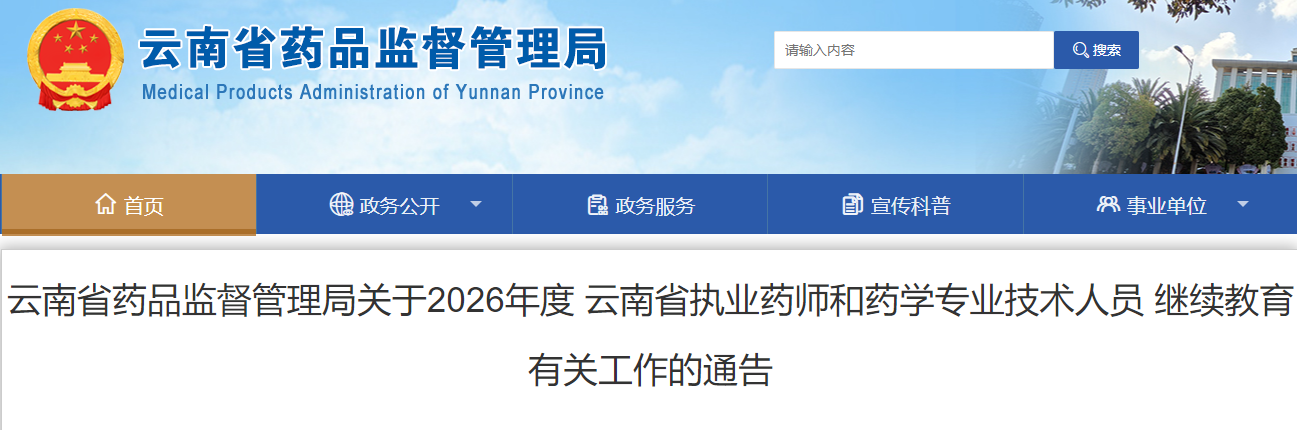 根据国家人社部《专业技术人员继续教育规定》(人力资源社会保障部令第25号)、《执业药师继续教育暂行规定》(国药监〔2024〕3号)《执业药师注册管理办法》(国药监人〔2021〕36号)、云南省人力资源和社会保障厅《关于印发云南省贯彻专业技术人员继续教育规定实施细则的通知》(云人社发〔2015〕319号)要求,为进一步做好2026年执业药师继续教育工作,现将有关事项通告如下:
