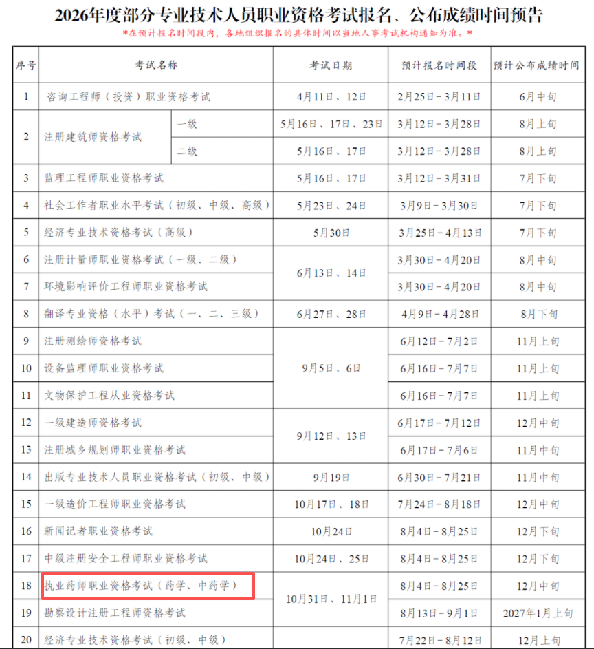 近日中国人事考试网发布《2026年度专业技术人员职业资格考试重要提示》,其中2026年执业药师资格考试的报名及考试时间已确定。